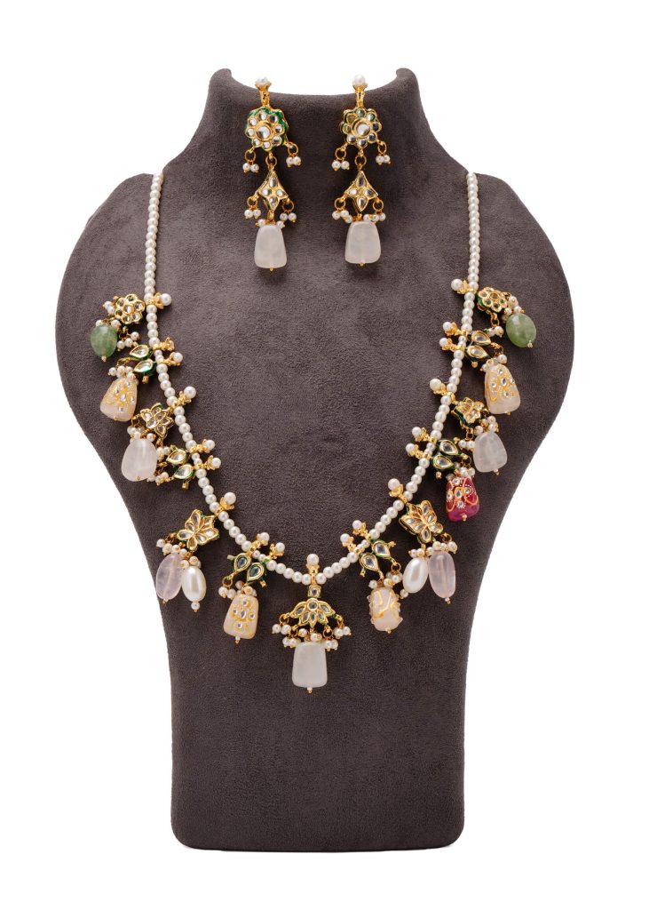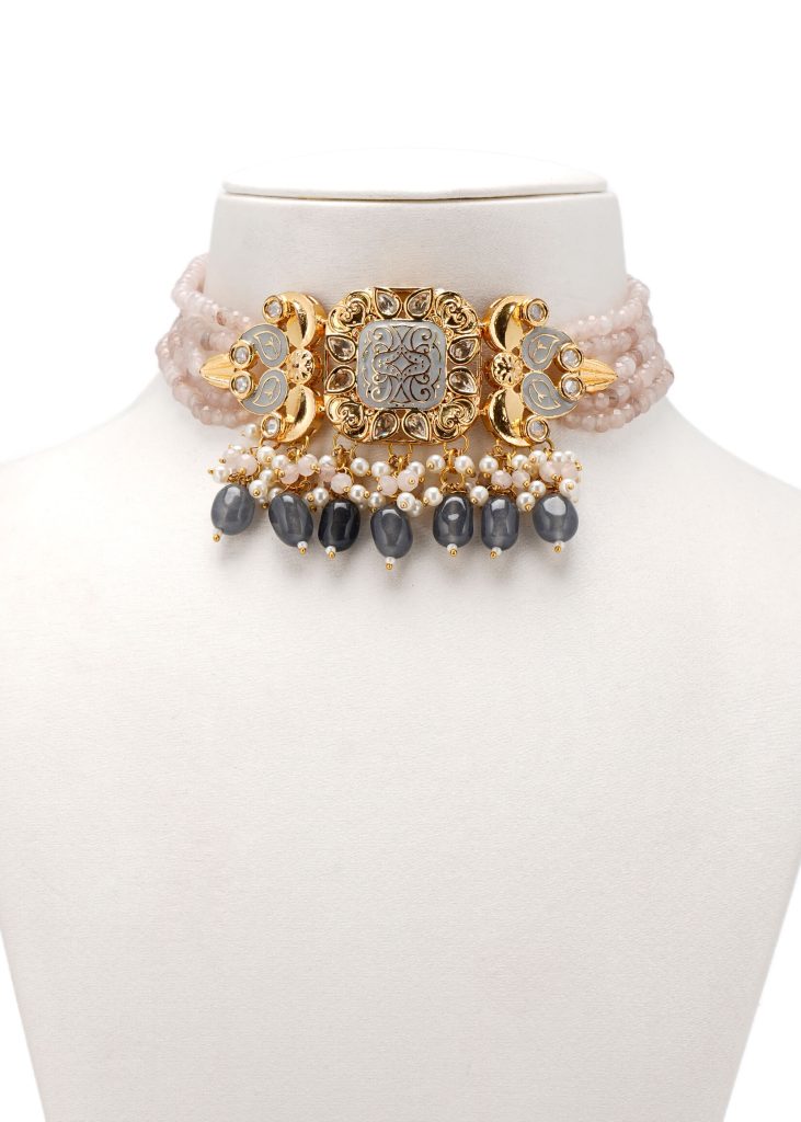 AED 50Enamel Work Necklace | Gold Metal Silver Kundan with Lulu & Gray Beads Tassel Details