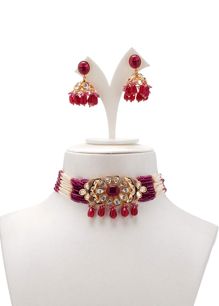 AED 350Pink Beads Jhumka | Gold Metal Silver Diamond with Ruby Tassel & Pearl Choker Set