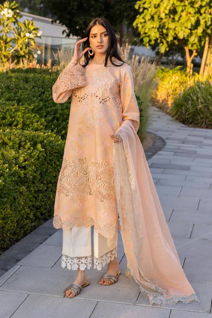 AED 250Rang Rasiya | Carnation Summer Edit | Zinnia | Peach | Stitched Embroidered Net Suit | 3 Pc.