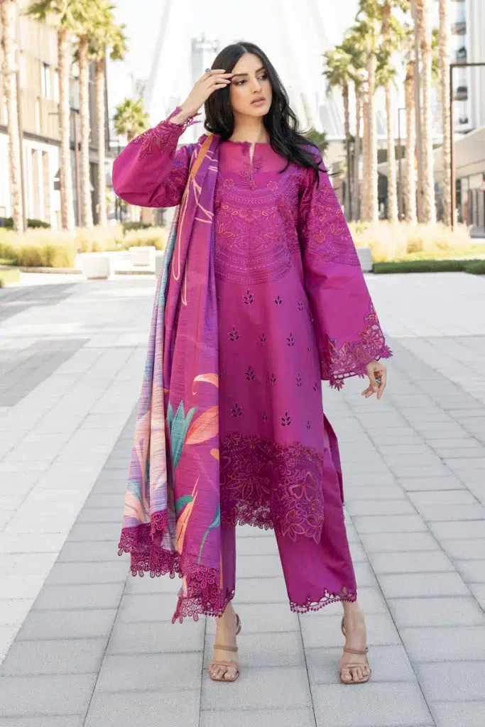 AED 250Rang Rasiya | Carnation Summer Edit | Mahra | Shocking Pink | Stitched Embroidered Net Suit | 3 Pc.